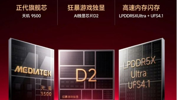 ويعمل الهاتف بمعالج MediaTek Dimensity 9500 مدعوم بشريحة رسومية إضافية مخصصة للذكاء الاصطناعي، ما يتيح أداءً قويًا في الألعاب التي تتطلب معدل تحديث مرتفع يصل إلى 165 هرتز بدقة 1.5K.